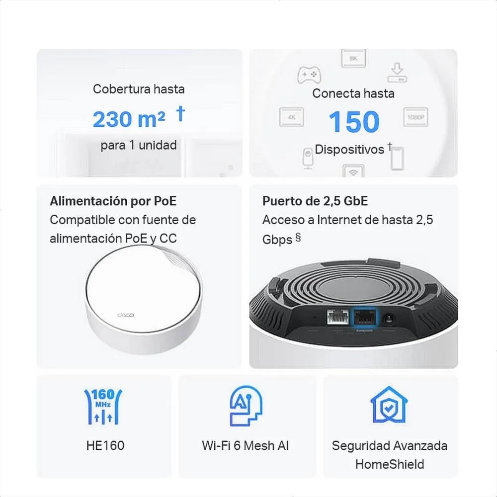 - Wi-Fi Mesh con AI. El sistema Deco aprende del entorno de la red para proporcionar la mejor conectividad optimizada a tu hogar