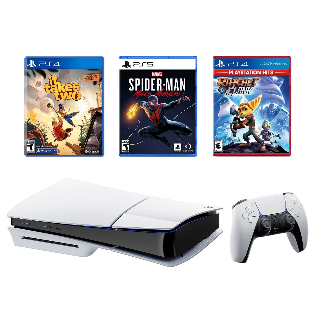 El paquete de la consola PlayStation®5 Slim- Ratchet & Clank: Rift Apart y Returnal, libera aún más posibilidades de juego. Este paquete de gran valor incluye dos juegos aclamados por la crítica de PlayStation Studios; Ratchet & Clank: Rift Apart y Returnal» Juega títulos de PS5 y PS4 en discos Blu-ray. También puedes descargar juegos digitales de PS5 y PS4 desde PlayStation® Store. Experimente una carga ultrarrápida con un SSD de velocidad ultraalta, una inmersión más profunda con soporte para retroalimentación háptica, disparadores adaptativos y audio 3D. y una generación completamente nueva de increíbles juegos de PlayStation®.