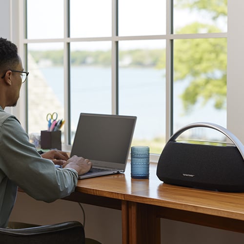 El diseño del altavoz de tres vías del Harman Kardon Go + Play 3 proporciona un sonido estéreo, nítido y detallado. Su subwoofer de 5” de vibración descendente ofrece unos bajos atronadores y precisos. Los altavoces de agudos duales y los amplificadores de rango medio proporcionan una reproducción perfecta de las voces y los instrumentos, mientras que el radiador pasivo adicional montado en la parte delantera le da un impulso extra. El Harman Kardon Go + Play 3 tiene una forma familiar, pero su última generación cuenta con un panel táctil con la parte superior de cristal templado, receptivo y muy intuitivo. El tejido de la rejilla es discreto y bonito, y el asa de aluminio de alta calidad, elegante y resistente, está diseñada ergonómicamente para llevarlo donde quieras. Con su batería integrada recargable . Con su diseño elegante, su resistente asa de aluminio de alta calidad y su panel táctil de cristal templado, el Harman Kardon Go + Play 3 tiene un cuidado diseño y un sonido estéreo tridimensional, claro y detallado que suena aún mejor. Además, se ajusta automáticamente al entorno para disfrutar siempre de tu música con un sonido insuperable. La batería integrada de 8 horas te acompañará durante toda una jornada laboral, y el práctico puerto de carga USB evitará que tu smartphone se quede sin carga en mitad de tu lista de reproducción. Además, incluso si estás sentado al otro lado de la mesa en la próxima conferencia telefónica, sus micrófonos duales integrados lograrán que se te oiga alto y claro. ¿Quieres más? Empareja dos Go + Play 3 de forma inalámbrica en tu próxima fiesta. El Harman Kardon Go + Play 3 es un altavoz que siempre está preparado para lo que le pidas.