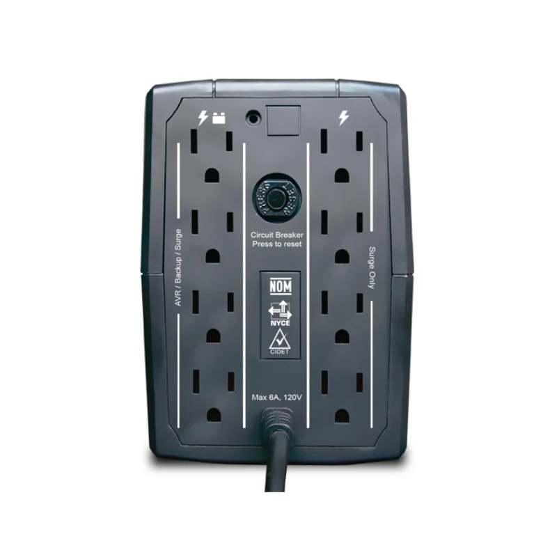 500VA Line Interactiva UPS con 8 puntos de venta NEMA 5-15 diseñados para casa/oficina. Baterías de ácido de plomo selladas internas, supresor de sobretensión del regulador de voltaje y salidas de bypass para cargas más grandes. Proporciona energía continua a los routers WIFI, sistemas de alarma y equipos de cómputo. Las alarmas audibles indican el funcionamiento y los niveles de batería. Certificado por las agencias reguladoras NOM,